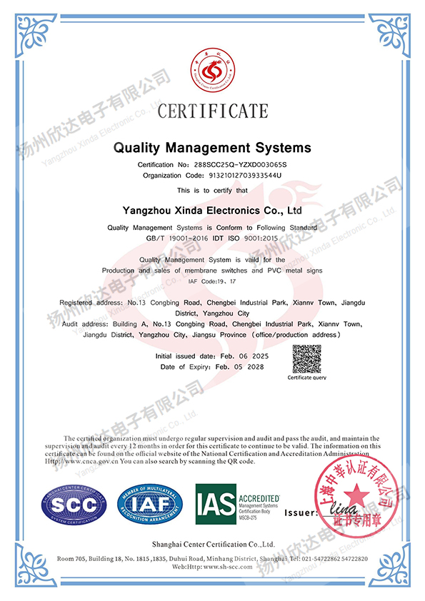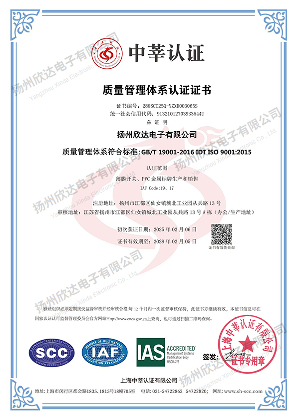 揚(yáng)州欣達(dá)電子有限公司是一家從事電子輕觸薄膜開(kāi)關(guān),薄膜面板及PVC、金屬標(biāo)牌,不干膠貼,噴塑、烤漆絲印面板等各種絲印工藝的有限責(zé)任公司。公司位于風(fēng)景秀麗的文化名城江蘇揚(yáng)州市江都區(qū)。自1993年建廠以來(lái),我們致力于信譽(yù)至上,顧客為首的原則,及時(shí)為廣大客戶提供合格滿意的產(chǎn)品:堅(jiān)持著質(zhì)量為首,持續(xù)改進(jìn)的方針,狠抓品質(zhì)管理,取得了客戶的認(rèn)可:履行著誠(chéng)信、互惠的宗旨,贏得了客戶的支持和信任。目前公司擁有先進(jìn)的絲網(wǎng)印刷設(shè)備,熟練的業(yè)務(wù)技術(shù)骨干和嶄新適用的廠房,每年為全國(guó)各地的客戶提供數(shù)億的合格產(chǎn)品。我們把“誠(chéng)信、務(wù)實(shí)、求精、創(chuàng)新”作為我們的企業(yè)宗旨,在經(jīng)營(yíng)管理中貫徹“以人為本,精益求精”的經(jīng)營(yíng)理念;在生產(chǎn)管理中嚴(yán)格按ISO9001質(zhì)量體系落實(shí)生產(chǎn); 在為客戶服務(wù)過(guò)程中按照產(chǎn)品的分類提供多種設(shè)計(jì)方案,讓我們產(chǎn)品更好體現(xiàn)客戶的理念。...